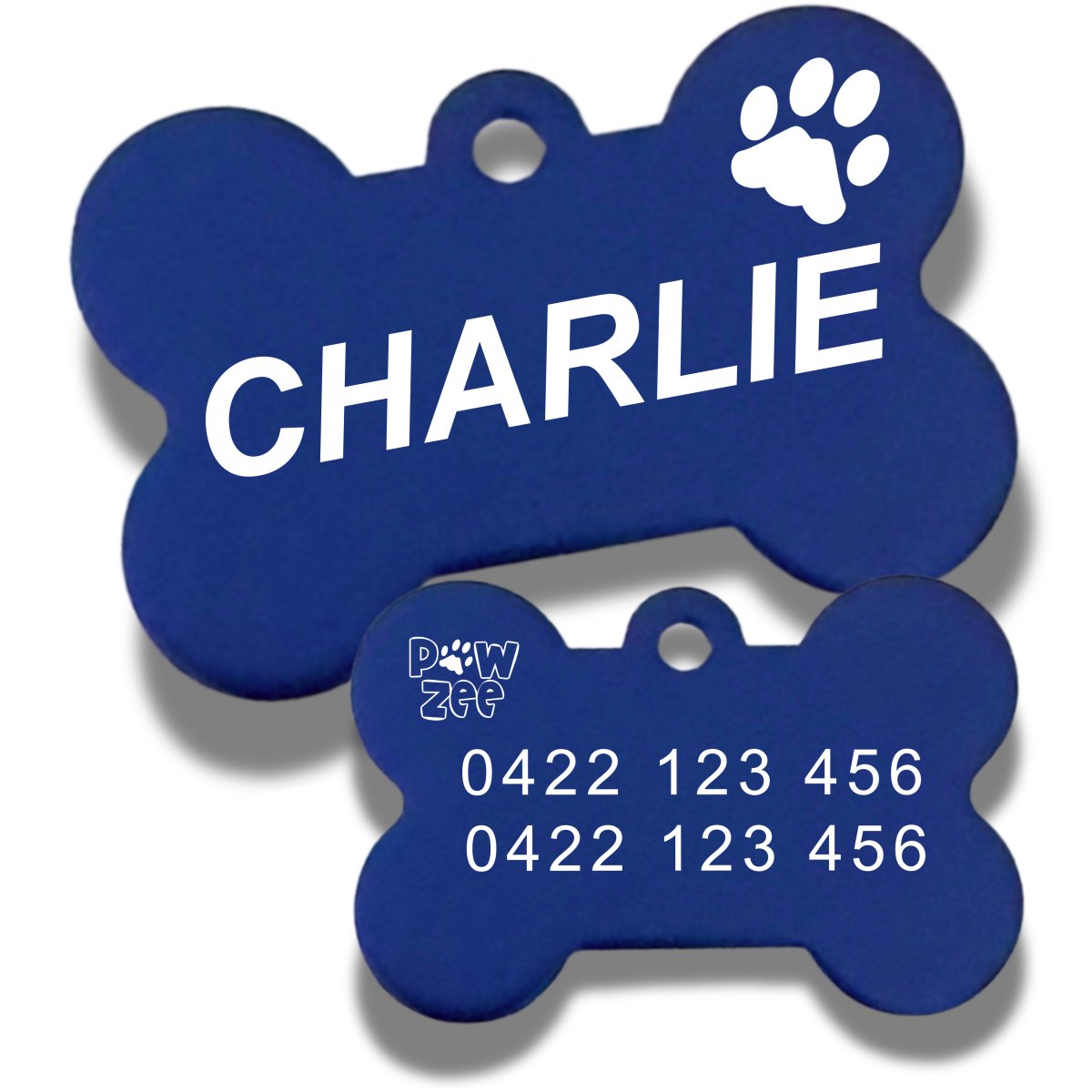 Engraved Dark Blue Pawzee Light Aluminium Dog Tags for dogs and cats are made in Australia from light weight aluminium and come personalised with your pets name in a LARGE BOLD FONT that stands out along with a cute paw print on the front and your contact details BIG and CLEAR on the back!